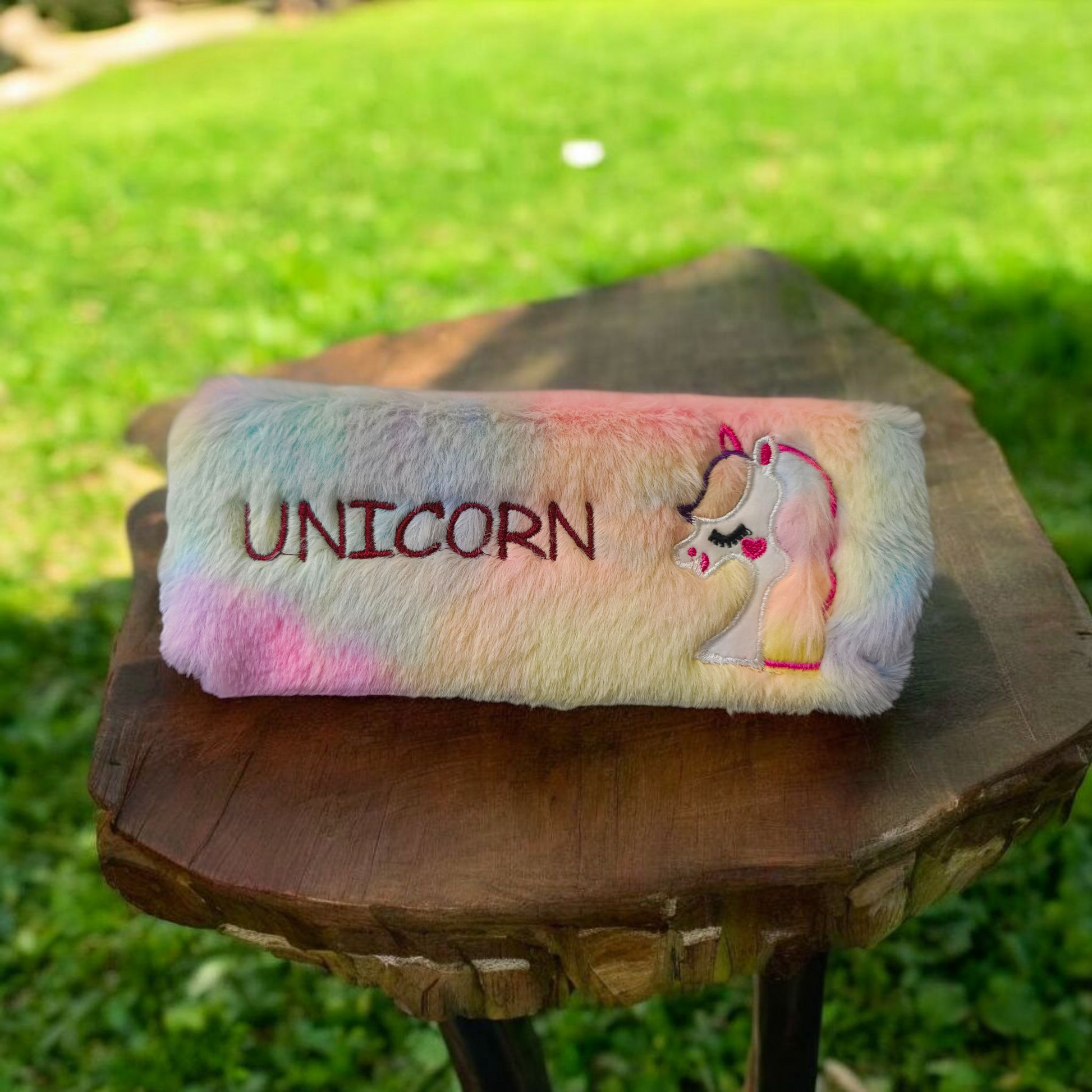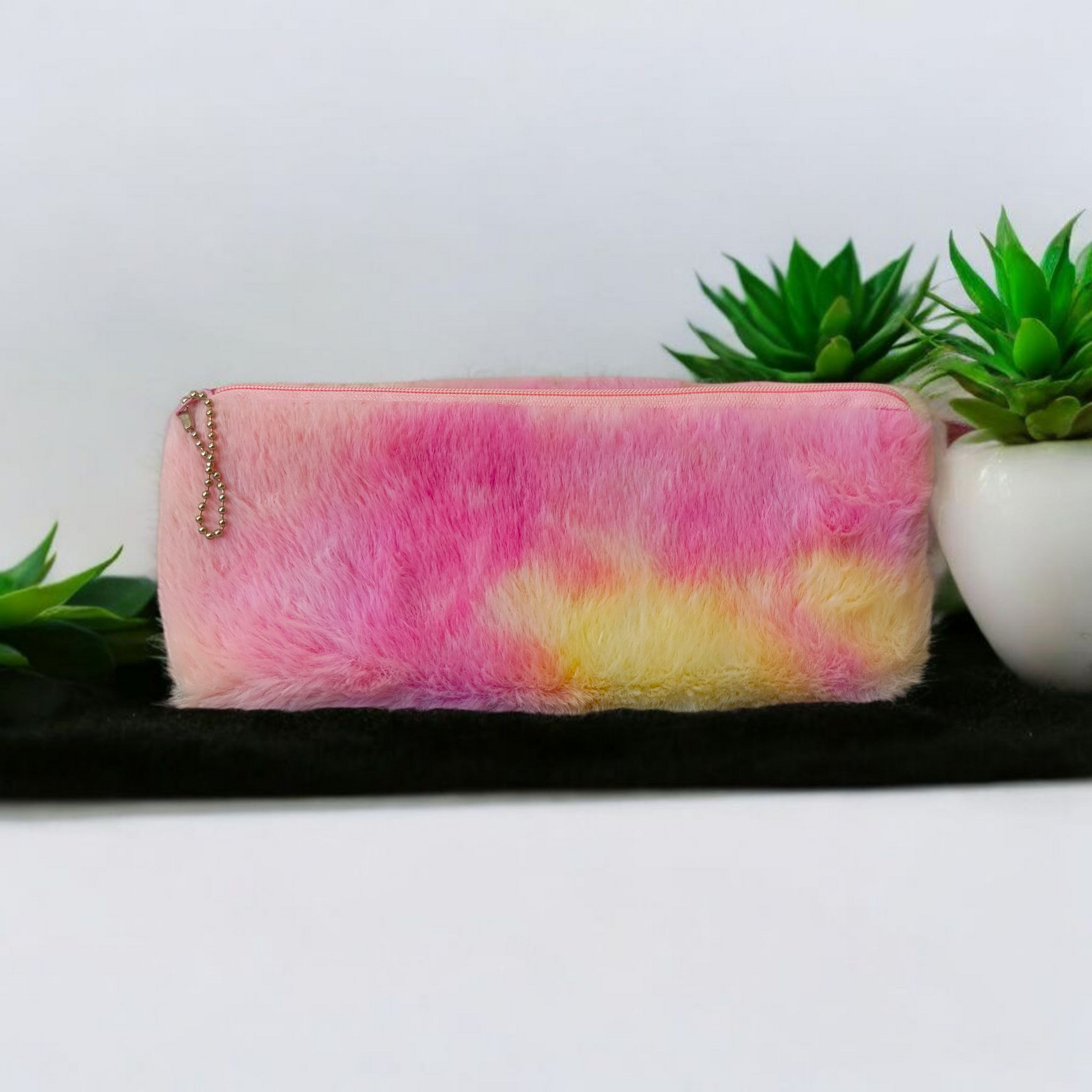 Furry Gradient Pencil Pouch – Soft Plush Case with Embroidery